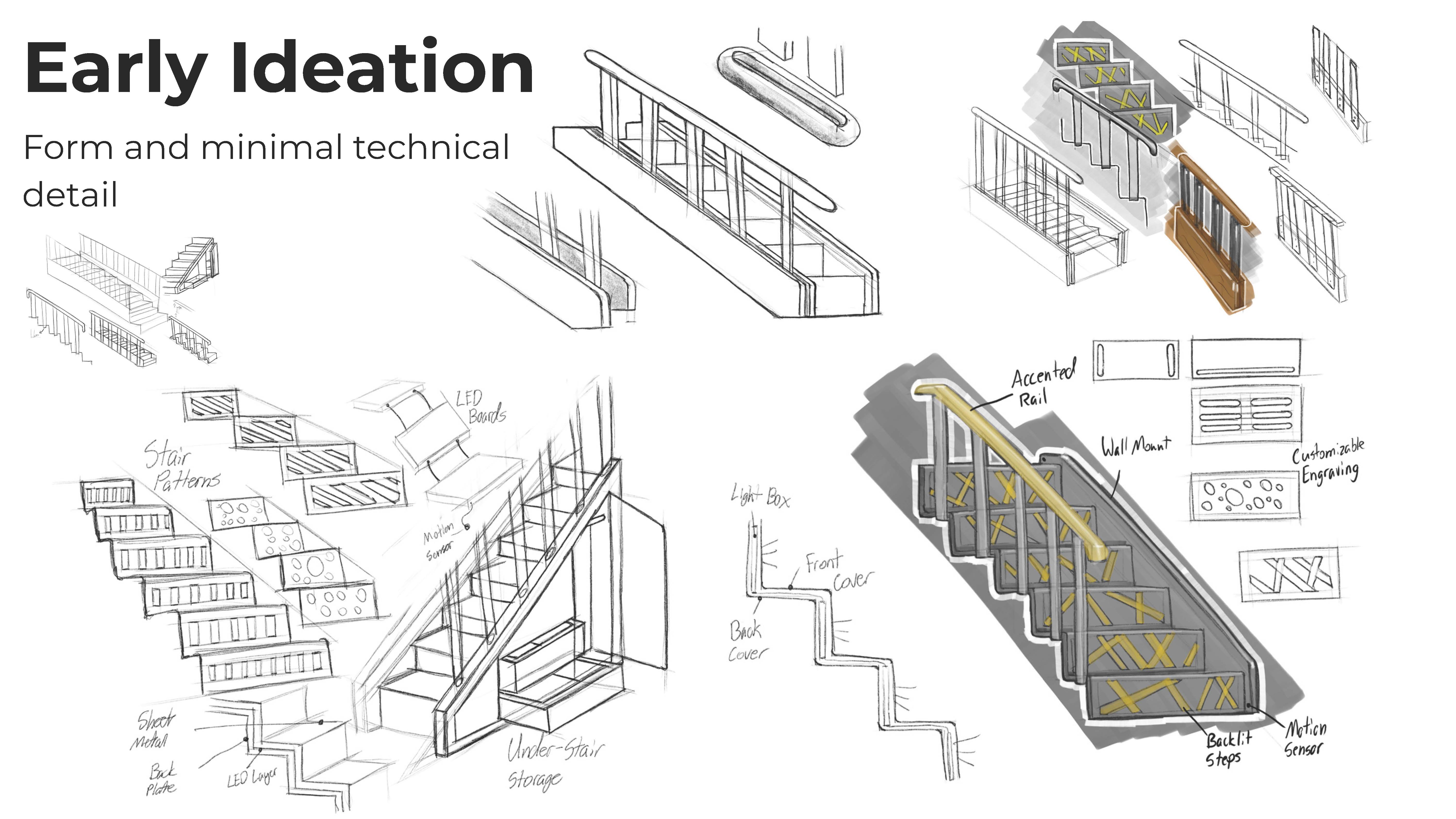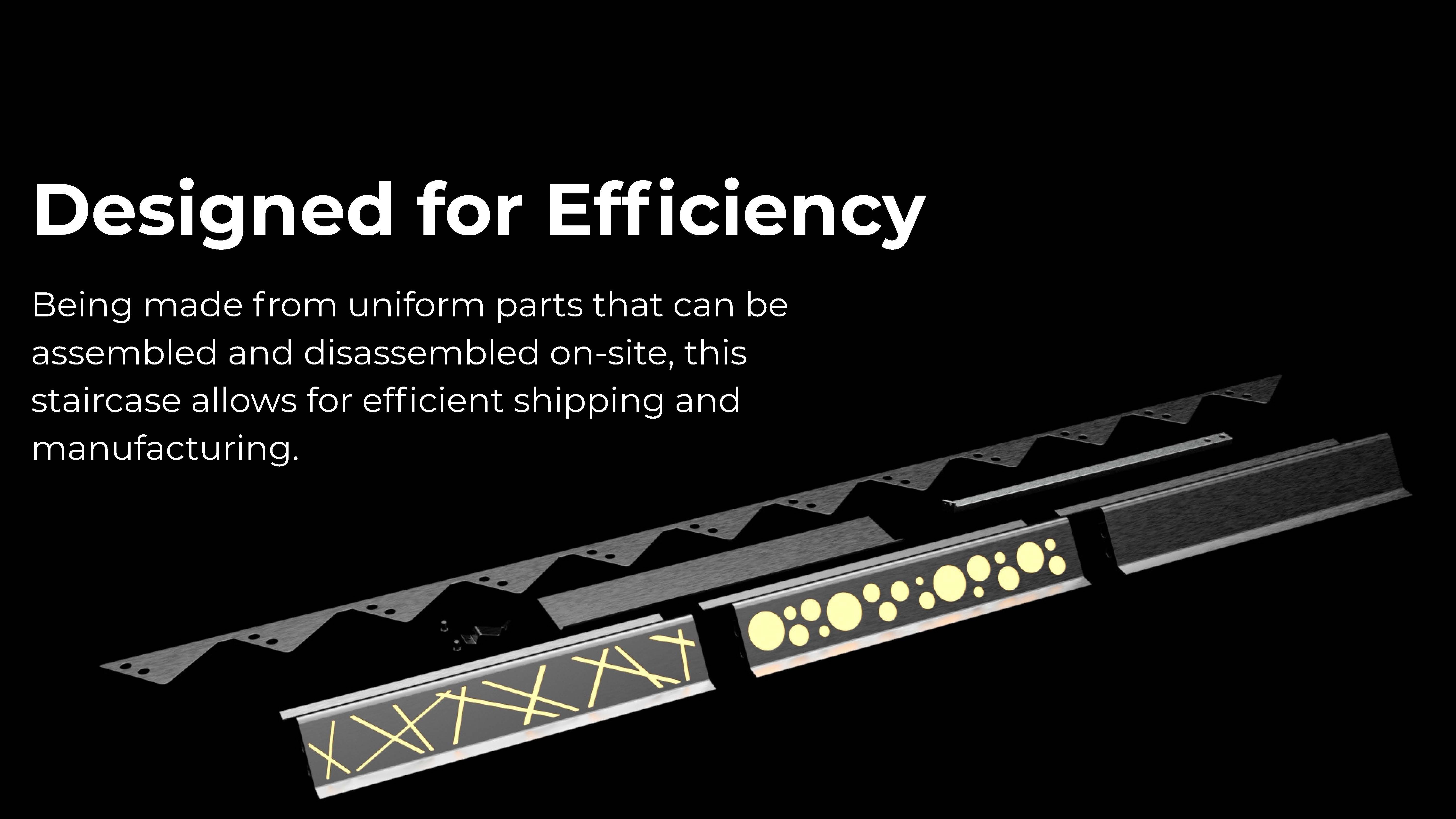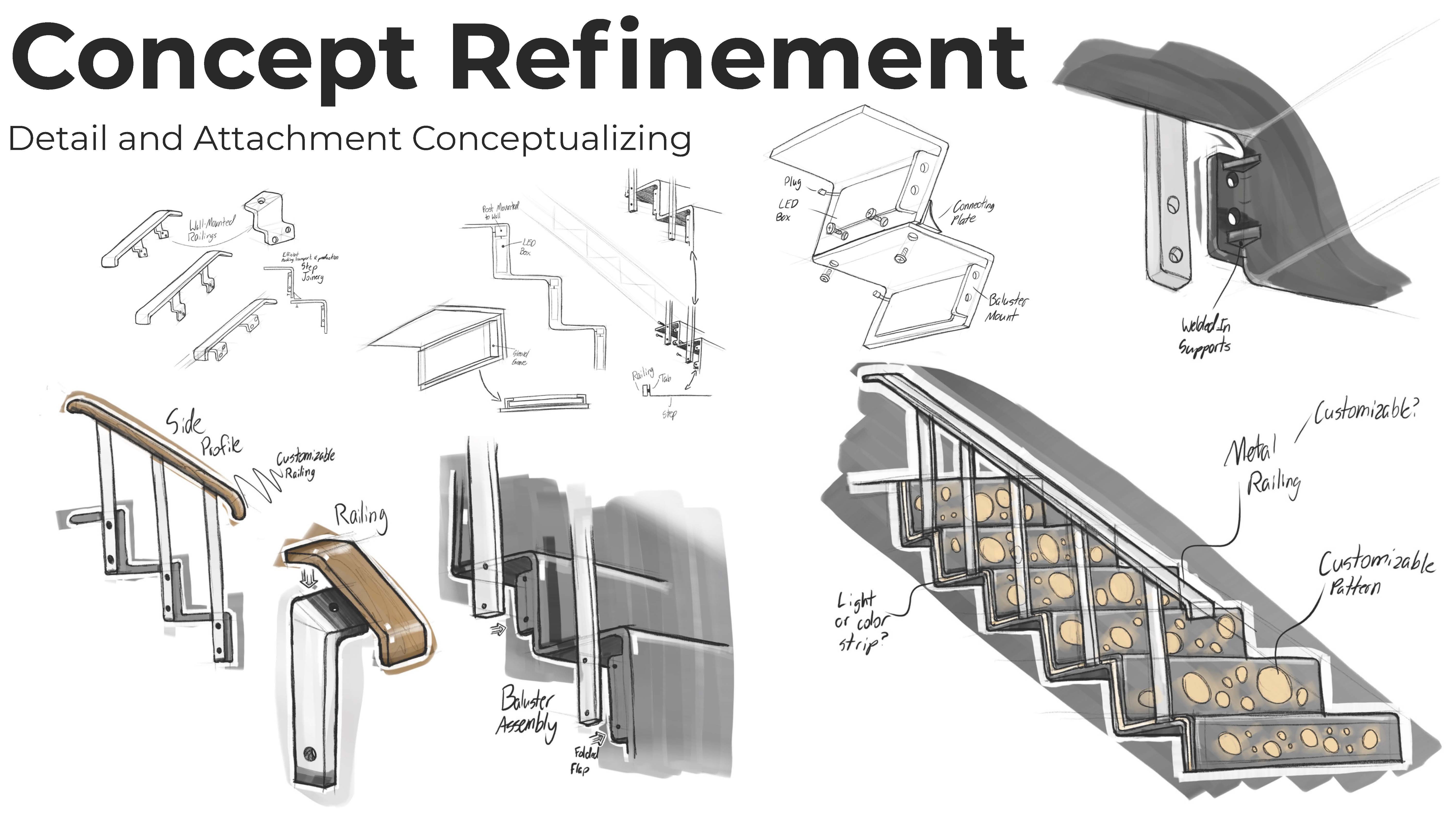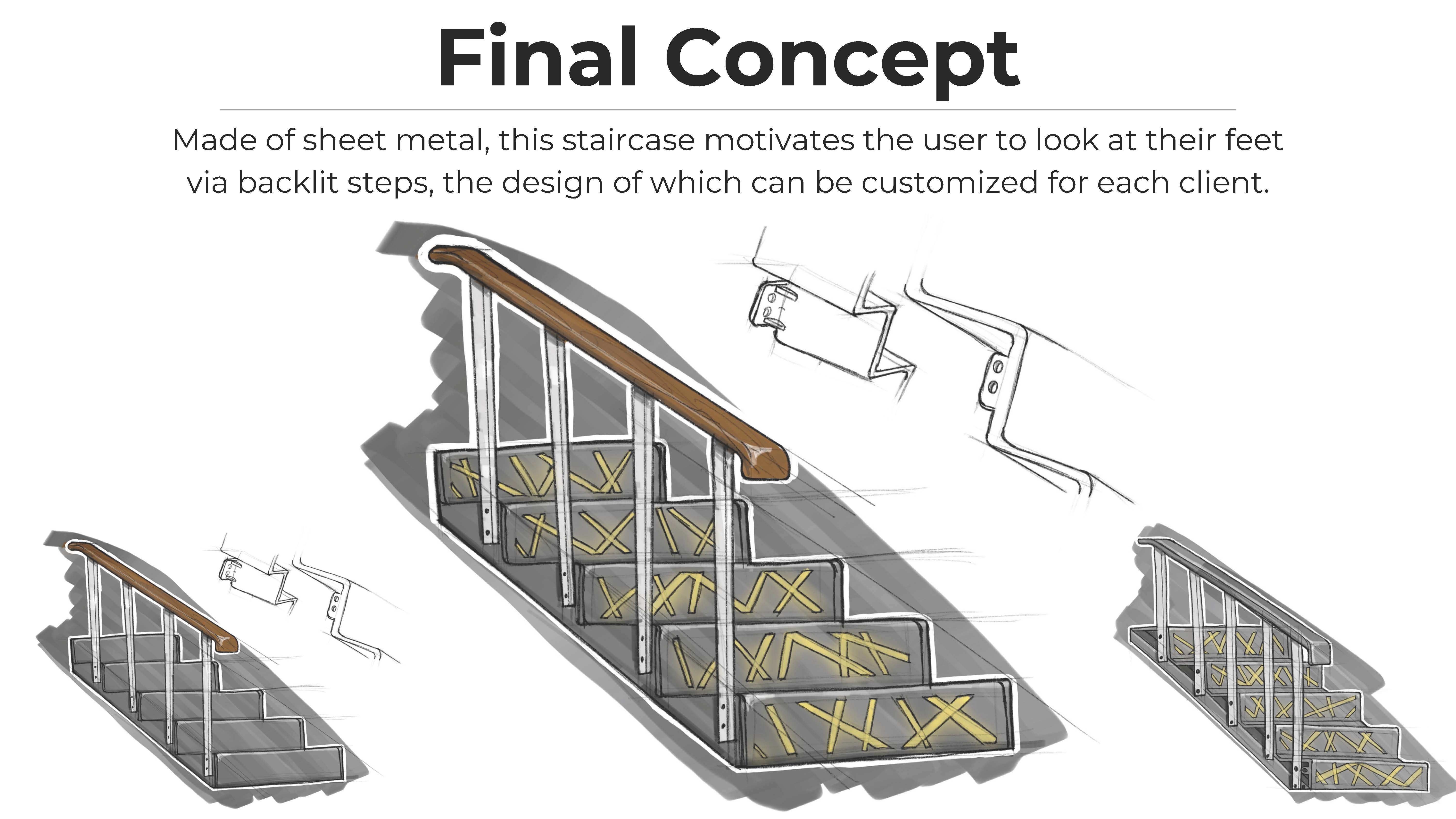 After finishing my research, my primary goal was to use backlighting to motivate the user to look down at the stairs, which will inadvertently reduce staircase accidents. My secondary goal was to create a product that can be manufactured, transported, and assembled with maximum efficiency by using sheet metal.