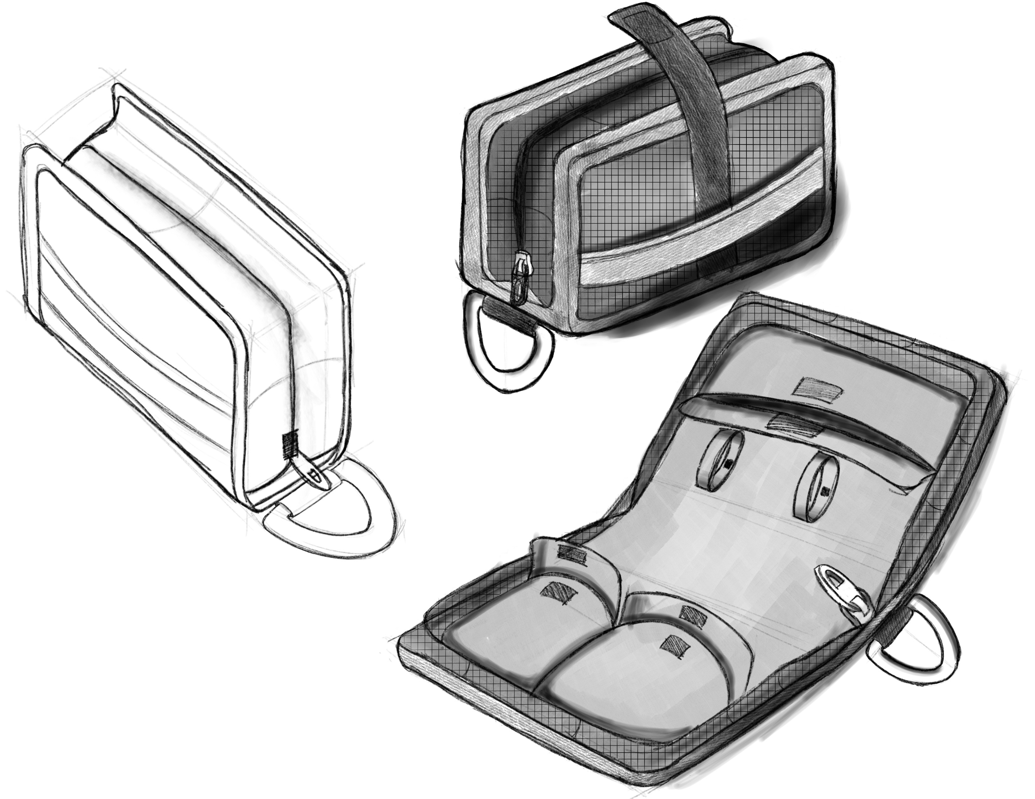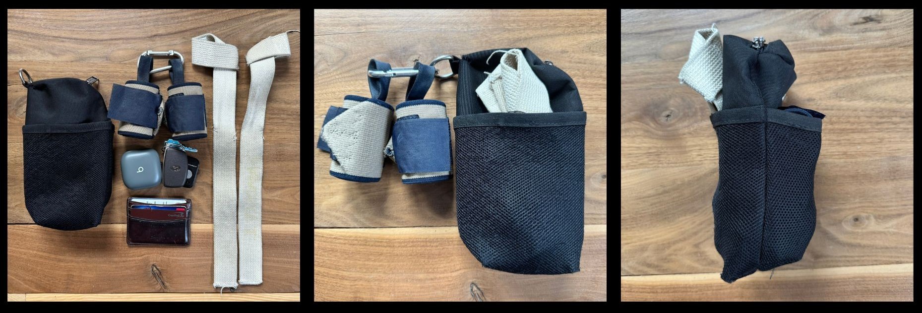 My goal is to create a gym bag with dedicated spaces for straps, wrist wraps, earbuds, and extra flexible space that is as small as possible and can be easily carried around by the user.