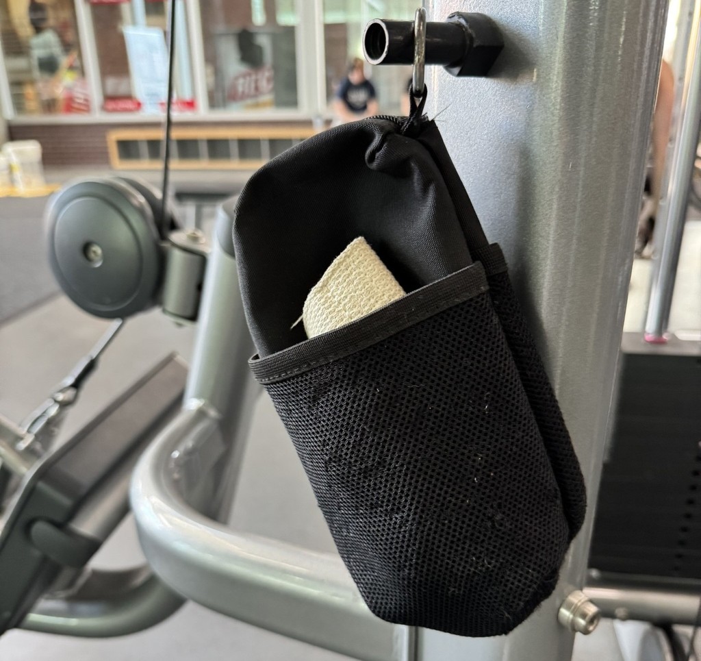 The magnetic accessory allows the bag to stick onto machine and racks, keeping the user's belongings off the ground.