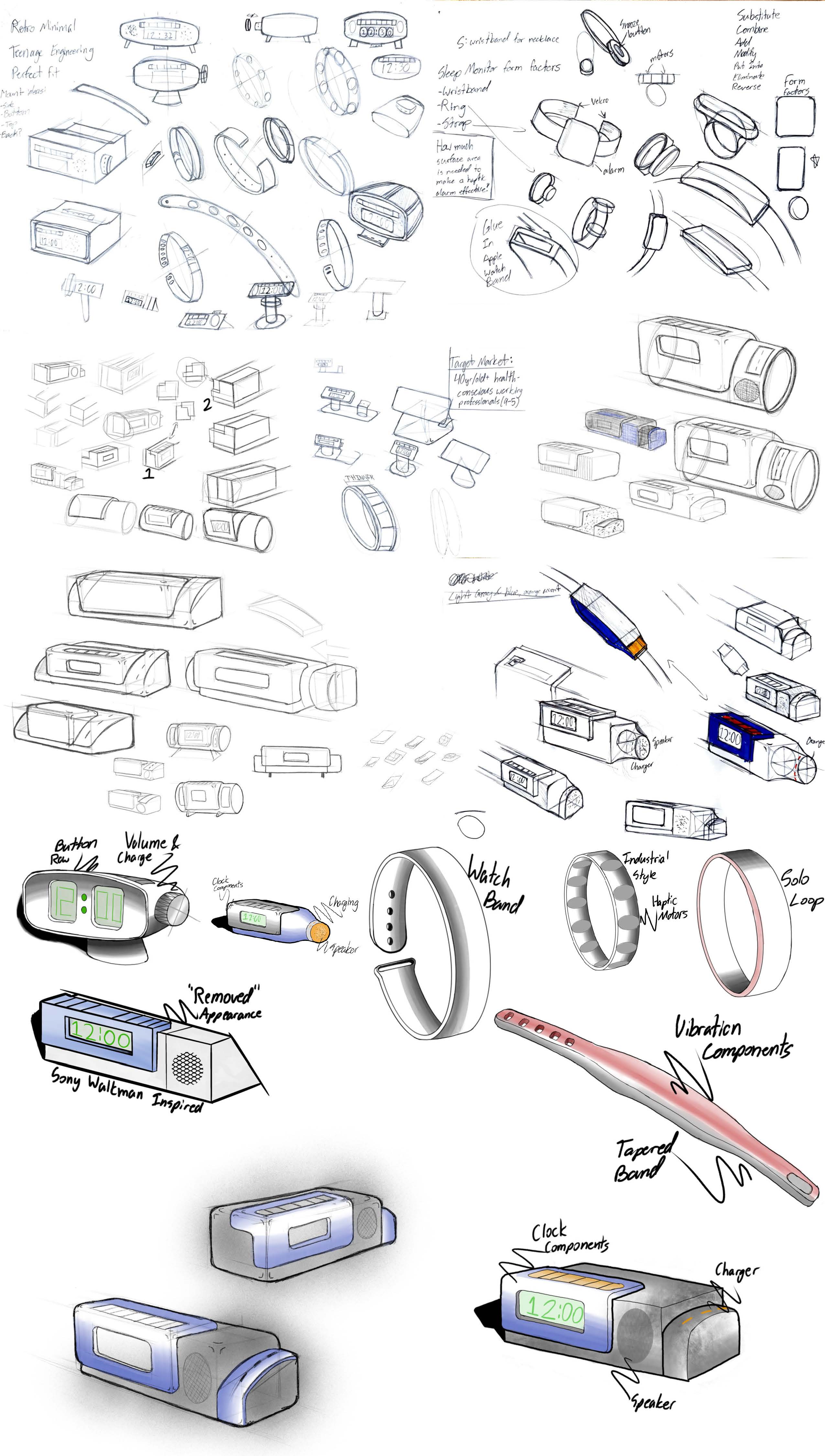 This concept utilizes retro design cues to appeal to the older 9-5 working professional market, and follows through on using a wristband to wake the user. The wristband is charged and the alarm time is set on the base station, which also displays the time.