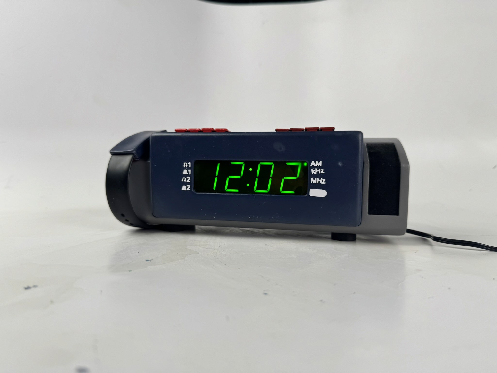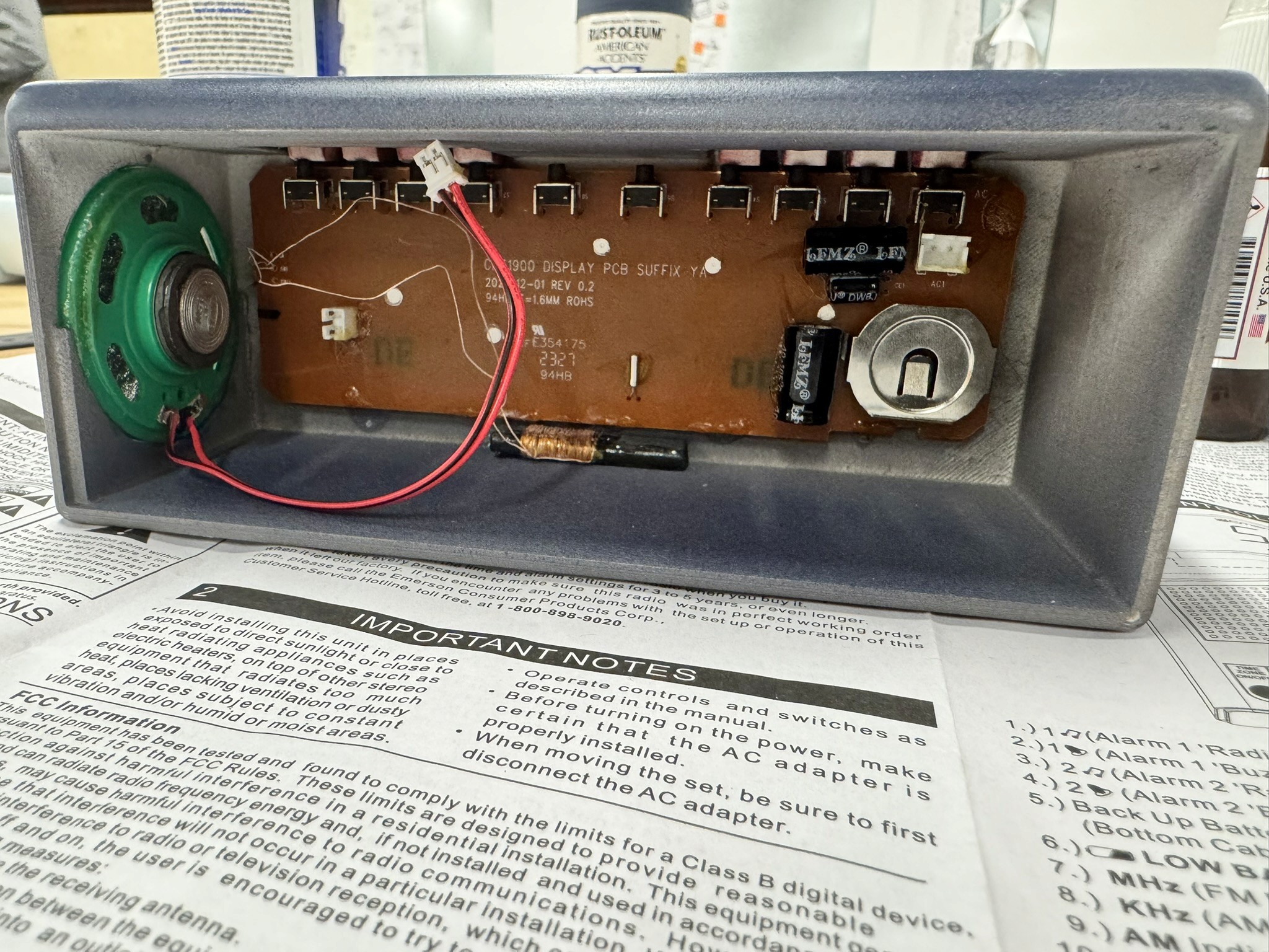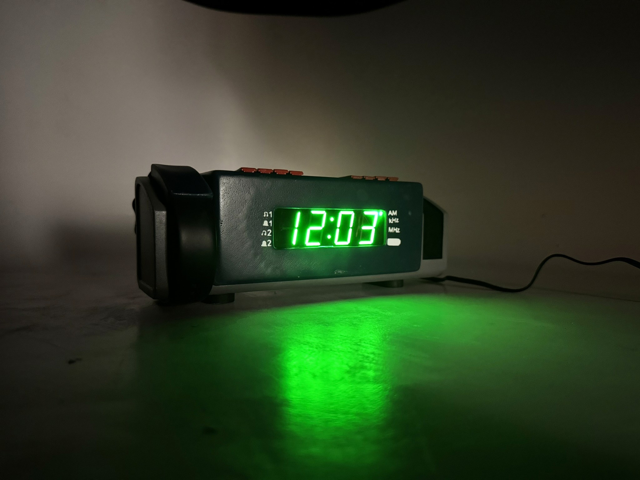 Having to use parts from an existing alarm clock, we designed our final model around the display unit and redirected the speaker unit out the side of the alarm, which was covered by a fabric speaker cover.